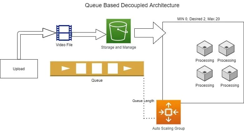 The N-Tier architecture can be evolved by using Queues. The upload component queues the job in FIFO (first in first out) queue and uploads the video file in the storage. Based on the size of the queue the processing component scales up utilizing the auto-scaling group. When the task is complete and the queue is empty then the processor component will scale down. This is a simple yet powerful architecture where most of the tasks are performed asynchronously and all the components are decoupled from each other.